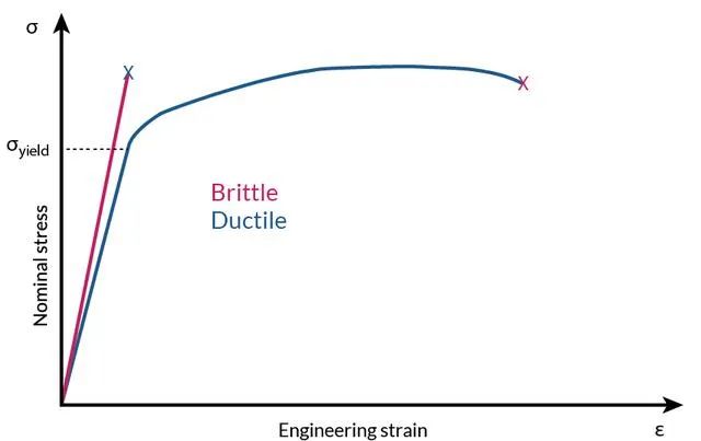 对于脆性材料(红线),应力达到极限强度时,直接断裂,比如玻璃就是典型的脆性材料。