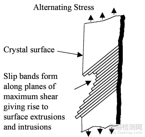 如果我们在高放大倍数下观察到有阶段一裂纹出现,我们可以看到交变应力会导致沿最大剪切力面形成持续滑移带。这些滑移带前后滑动,很像一副纸牌,导致表面凹凸不平。表面下凹最终形成“萌芽期的”裂纹,如图3所示。阶段一裂纹以此模式扩展,直至遇到晶界时会暂时停下,当有足够的能量施加给相邻晶体,然后这个过程将继续。