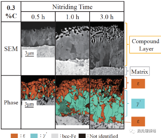 图5显示了氮化后的C30表层的SEM图像以及EBSD法的相结构分析结果。氮化时间为0.5h时,整个化合物层是以ε相为主体的ε + γ′混相。氮化时间为1.0h和3.0h的产品与C10氮化材料一样,在中间位置以γ′相为主。另一方面,与C10相比,母相侧的ε相比例提高,化合物层的结构从表层到深度方向分别为ε单相、γ′单相、ε + γ′是混相。