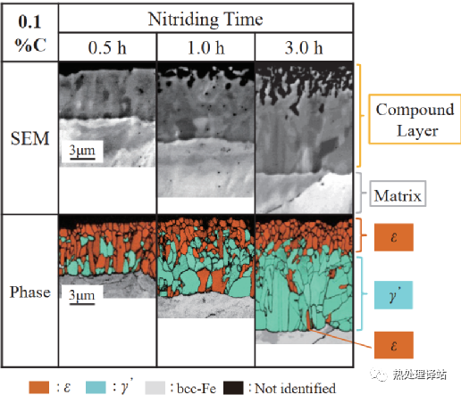 图4 0.1%C钢氮化0.5、1.0和3.0h后截面的SEM图像和EBSD相位影像