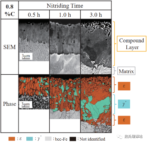 图6显示了氮化后C80表层的SEM图像观察及EBSD法的相结构分析结果。在氮化时间1.0h之前,整个化合物层都是ε相主体的ε + γ′混相。氮化时间为3.0h的时候,呈现出与C30相同的结构,但深度方向中间位置的γ′相比例和母相一侧的ε相比例更高。