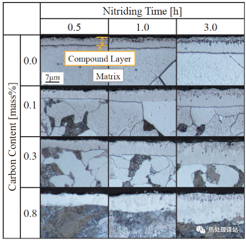 图2显示了氮化后试样断面表层的光学显微镜照片。在任何一种钢种及氮化时间下,在钢的表面都观察到被认为是化合物层的白色耐腐蚀层。化合物层的厚度随着母材的含C量和氮化时间的增加而增大。