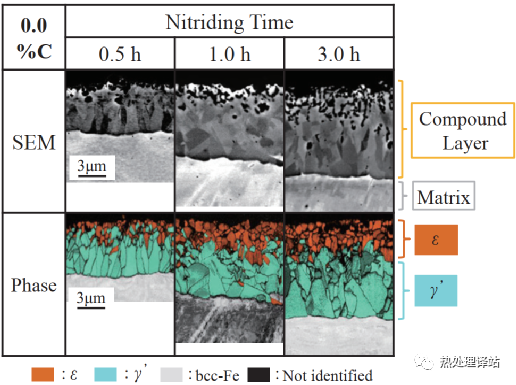 图3 0.0%C钢氮化0.5、1.0和3.0h后截面的SEM图像和EBSD相位影像