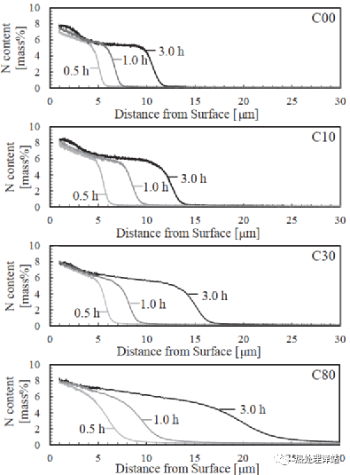 图7表示对C00、C10、C30和C80进行氮化时N浓度曲线随时间的变化。N浓度在任何一种氮化时间内,都是最表面最高,之后随着离表面距离的增加而减少,在相当于化合物层厚度的深度后急剧下降。N浓度方面,最表面约为7.5mass%,深度中间位置约为6.5mass%,急速下降前约为5.7mass%,不论氮化时间长短,几乎都是恒定的。