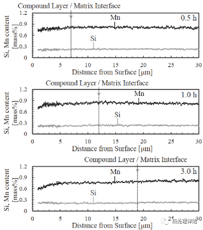 2)无论在哪个时间,表层的Si和Mn浓度在深度方向上都是均匀的,没有向化合物层分配。