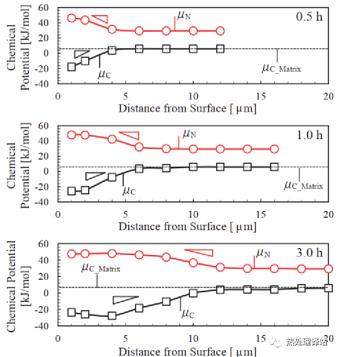 图11 根据N和C的分布,用thermocalc 2016b计算0.8%C钢氮化0.5、1.0和3.0小时化合物层中化学势分布