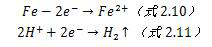 金属材料与酸接触,发生腐蚀析出氢气,也是析氢腐蚀。水中含有盐酸,或者游离的二氧化碳溶解导致水中PH低于7,都有可能产生析氢腐蚀。析氢腐蚀是以作为去极化离子的一种电化学腐蚀,该腐蚀常常发生于给水系统和凝结水系统,但是在省煤器中也有可能出现该类型的腐蚀,其反应如下: