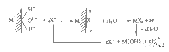 使同小蚀坑接触的溶液层的pH值下降,形成一个强硬性的溶液区,这反过来加速了金属的溶解,使蚀孔扩大、加深。随着蚀孔的加深和形成的腐蚀产物覆盖坑口,使孔内外溶液之间的物质迁移更加固难,孔内金属盐愈益浓缩。这一方面靠其加水分解导致pH值愈益下降;另一方面靠孔内正电荷过剩形成电场,使Cl-借电泳作用通过孔口和腐蚀产物(盖子)的孔隙不断扩散进来,导致Cl-在孔内的富集。这种随着局部腐蚀过程的进行,使闭塞区(蚀境内)愈益酸化的过程叫做“自催化的酸化过程”。蚀孔内溶液的pH值降低和Cl-富集可以达到很严重的程度。蚀孔内的这种强酸环境使蚀孔内壁处于活性态,为阳极;而孔外大片金属表面仍处于钝态,为阴极,构成由小阳极次阴极组成的活性态——钝态电池体系,使蚀孔加速扩大、加深。这种电池的电势(蚀孔内外表面的电位差)是点蚀发展的推动力。孔蚀内部的反应可归结如下图: