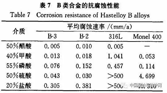 B系列有B、132、B3,此类哈氏合金在典型环境下的耐蚀性能如表7所示。Hastelloy B合金的耐盐酸腐蚀性最好。将Hastelloy B合金的碳含量降至0.02%、Si含量降至0.1%,即成为Hastelloy B-2合金。它可以在沸腾温度下任何浓度的盐酸介质中使用,并改善了敏化状态和焊后状态的抗晶间腐蚀性能。