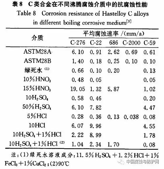 Hastelloy C为Ni-Cr-Mo系,是能适应各种环境的通用型耐蚀材料。C系列合金化程度较高,Cr元素和Mo元素分别起到耐氧化性介质和还原性介质腐蚀的作用,并共同起到抵抗局部腐蚀(点蚀和缝隙腐蚀)的作用。C类合金在典型环境下的耐蚀性能如表8所示。