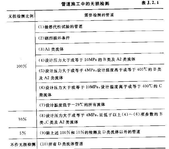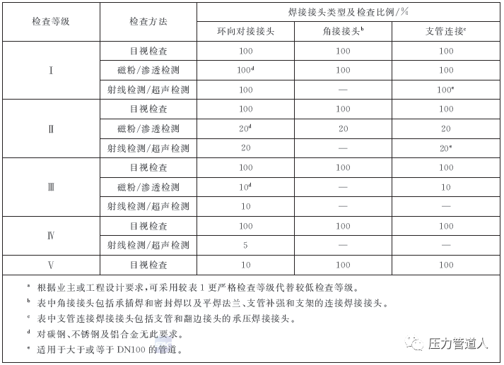 GB50235《工业金属管道工程施工规范》和GB50184《工业金属管道工程施工质量验收规范》体系将工业管道分为分为Ⅰ、Ⅱ、Ⅲ、Ⅳ、Ⅴ五个等级,这种分法所执行的原则与GB20801并不相同。而后,按下表确定无损检测比例: