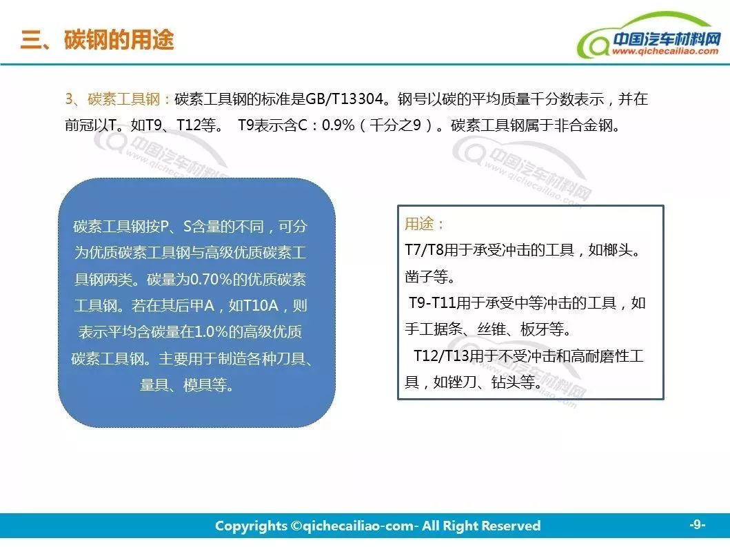 普通碳素结构钢:普通碳素结构钢的标准是GB/T 700--2006。它对碳含量、性能范围以及磷、硫和其他残余元素含量的限制较宽。普通碳素结构钢分为三类:甲类钢(A类钢)是保证力学性能的钢;乙类钢(B类钢)是保证化学成分的钢;特类钢(C类钢)是既保证力学性能又保证化学成分的钢。