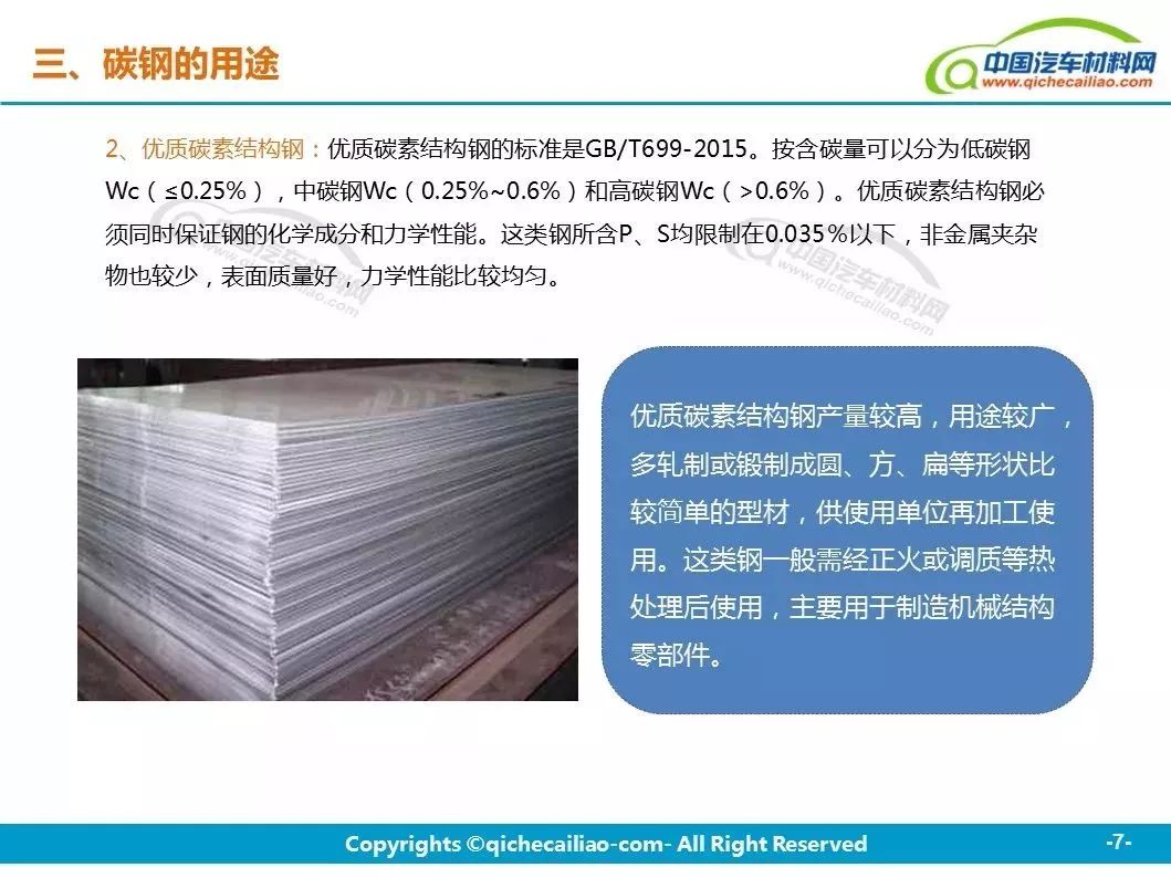 在各类钢中碳素结构钢的产量最高,用途很广,价格最低,具有适当的强度、良好的塑性、韧性、工艺性能和加工性能,多轧制成板材、型材(圆、方、扁、工、槽、角等)、线材和异型材,用于制造厂房、桥梁和船舶等建筑工程结构,一般在热轧状态下直接使用。