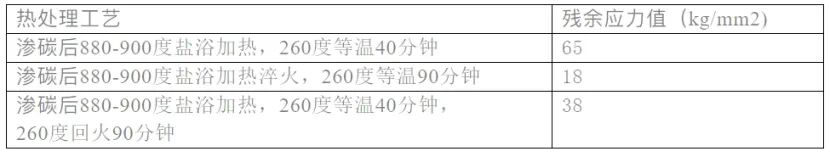 如渗碳淬火的残余应力一般在表面压应力较低,最大压应力则出现在离表面一定深度处,而且残余压力层较厚。氮化后的表面残余压应力很高,但残余压应力层很浅,往里急剧下降。如果采用渗碳-氮化复合强化工艺,则可获得更合理的应力分布状态。因此表面复合强化工艺,如渗碳--氮化,渗碳--高频淬火等,都是值得重视的方向。