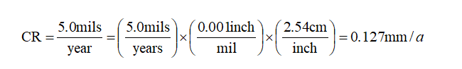 碳钢在海水中的均匀腐蚀速率CR为5 mpy(mils per year,其中1mil=0.001 inch,1inch = 2.54 cm),换算为毫米/年(mm/a),腐蚀速率为0.127 mm/a。