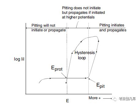 (3)点蚀发生在特定的临界电位以上,称作点蚀电位(Epit)。对动电位极化曲线回扫,电位又达到钝态电流对应的电位,该电位称作再钝化电位或保护电位(Eprot)。点蚀发生和发展的电位与Epit和Eprot有如下关系: