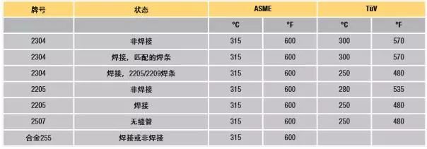表2 压力容器设计规范对各种双相不锈钢最大许用应力下的温度限值
