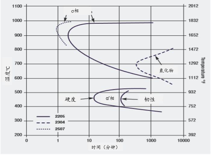 图4 2205双相不锈钢等温析出曲线,1050℃退火 (分别给出了2304和2507双相钢σ相和氮化物析出曲线作为对比)