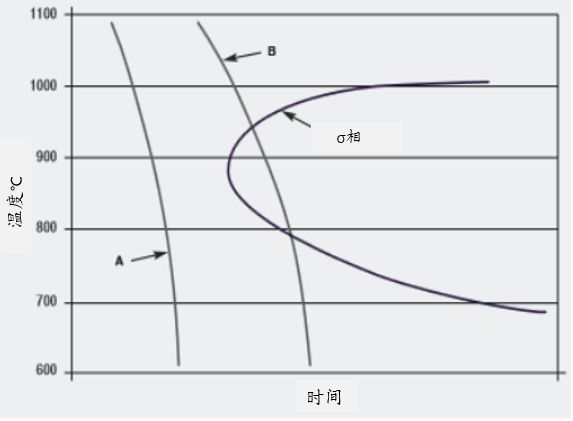 图6 从固溶退火温度冷却应该足够快(曲线A)以避免σ相的形成区间