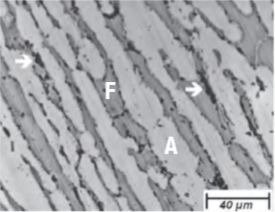 图5 在850℃下时效处理40分钟的2205双相钢样品的金相组织显示出在奥氏体/铁素体境界σ相的析出(箭头)。显微照片中铁素体相(F)比奥氏体相(A)颜色深。