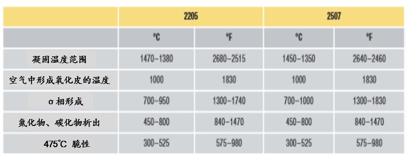 当铁素体不锈钢长时间暴露在475℃左右的温度后,其中的α'相会造成常温韧性的丧失,这就是所谓的475℃脆性。幸运的是,由于双相不锈钢含有50%的奥氏体,这种硬化和脆化的效果不像它在全铁素体钢中那样有害。它对双相不锈钢有影响,在高钼牌号中影响最显著,在经济型牌号中影响小得多。