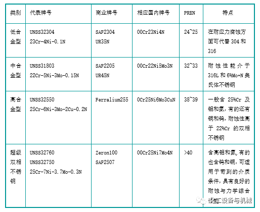 部分奥氏体不锈钢和双相不锈钢的典型化学成分对比(约数值)