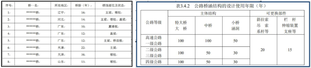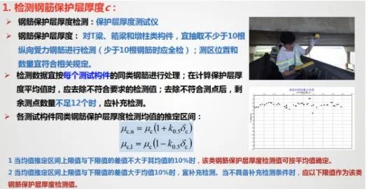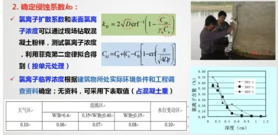 环境特点与耐久性现状 (一)海洋环境的特点 ◇ 氯盐:腐蚀钢筋; ◇ 硫酸盐、镁盐:腐蚀混凝土; ◇ 劣化特征:钢筋锈蚀;混凝土结构表面疏松露骨、锈胀开裂; ◇ 同一混凝土桥梁,在相同使用年限内,海洋环境中氯离子诱发钢筋锈蚀的可能性是一般大气环境中混凝土碳化导致钢筋锈蚀的几百倍。 ◇ 海岸线附近1~2公里范围内及近海海域基本上都属于海洋环境。(山东海洋总体规划区域) (二)耐久性现状 ◇ 部分沿海桥梁,耐久年限非常短,通常在10~20年左右即出现钢筋锈蚀现象; 3. 我国混凝土桥梁耐久性总体呈现阶段性特点 我国公路桥梁总体耐久性良好,但也存在阶段性特点和部分耐久性不足现象。桥梁耐久性问题需要引起重视。 (三)耐久性不足的危害 耐久性是保障公路桥梁安全耐久使用的重要性能,是第一道屏障; 海洋环境对桥梁混凝土结构和钢结构都是一种恶劣的环境,在养护中应加以重视。 外观耐久状态检测 (一)海洋环境中混凝土桥梁的典型耐久性病害 耐久性降低的表现形式 ◇ 耐久性病害可以分为两大类:可以目视发现的和不能发现的,这两者都可以导致构件性能的保持能力降低,或者说,是性能保持能力降低的具体体现。 • 目视可以发现的是外观耐久状态,分为两种: 1)一是耐久性降低导致结构构件表面发生明显可视变化,即外观劣化; 2)二是结构构件防护或保护措施不足在结构构件表面的表现,即质量缺陷; • 目视不能发现的是结构或构件材质性能在环境作用下的潜在性能劣化,这需要通过检测分析、预测保持结构或构件性能不降低的潜在性能劣化的时间。这个时间即为剩余耐久年限。 (二)构建外观耐久状态检测评定方法 1. 评定标准 ◇ 外观耐久状态评定可分为外观质量缺陷评定和外观劣化度评定 ◇ 以两者中差者等级作为外观耐久状态评定等级 2. 检测评定指标 ◇ 混凝土构件外观质量缺陷指标宜包括非锈蚀裂缝、蜂窝及麻面、孔洞; ◇ 钢筋锈蚀导致的外观劣化度检测指标宜包括锈蚀裂缝、剥落露筋和表面析出物; 3. 构件单元等级评定 剩余耐久年限预测 (一)构件剩余耐久年限检测评估思路 估算思路:剩余耐久年限可采用劣化模型法或时间外推法进行计算。 (二)海洋环境中混凝土构件剩余耐久年限预测方法 (三)构件剩余耐久年限检测与估算过程 (四)构件单元剩余耐久年限评定 环桥梁耐久性检评程序 耐久性检测评定程序 1. 桥梁调查 ◇ 桥梁调查内容:资料、桥位环境和外观;必要时尚应进行构件材料成分分析。 1)资料调查:桥梁设计文件和竣工资料、桥梁服役历史、桥梁检查和维护资料; 2)现场使用环境调查:桥梁所处环境作用类别、作用等级和结构构件局部环境以及交通流量等; 3)外观调查:初步确定构件表观耐久性状况,支撑构件评定单元划分; ◇ 在桥梁调查过程中,应确定桥梁耐久性主要劣化形式、劣化机理和劣化发展情况。 2. 划分构件类别,确定评定单元 3. 确定评定单元中检测构件数量 ◇ 公路桥梁耐久性评定单元中的构件可全数检测,也可抽样检测,并应符合下列规定: 1)当评定单元中的构件数量不超过3个时,应采取全数检测方式; 4. 开展构件评定单元耐久性检测评定 采用外观耐久状态和剩余耐久年限相结合的办法(前述二、三) ◇ 当不能定量估算构件剩余耐久年限时,可采用外观耐久状态等级作为耐久性等级; ◇ 当构件有表面防护涂层等防护措施时,宜对涂层劣化状态保护效果进行检测评定。 涂层劣化状态的检测评定