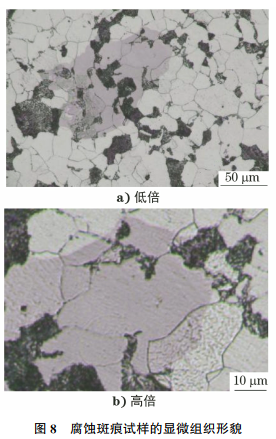 金相试样表面抛光划痕残留,引起表面粗糙度较大,造成了漫反射现象,最终导致晶粒发灰。采用延长抛光时间、减小抛光力度、使用更小粒度的抛光膏等措施可以使铁素体晶粒表面划痕变浅,划痕较为细小,从而得到绝大多数呈亮白色的铁素体,提高了金相检验结果的准确性。
