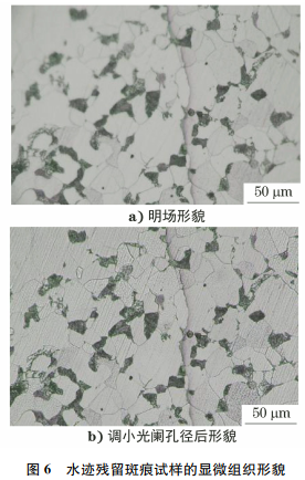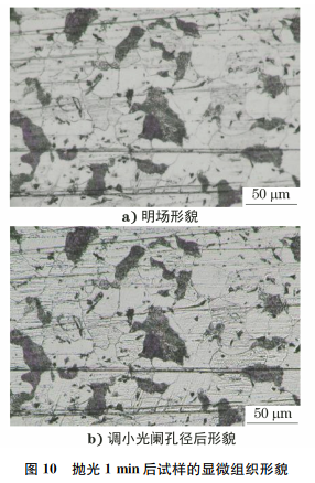抛光3min后试样的金相检验结果如图11所示。由图11可知:试样表面基本没有粗大划痕,残余较多的细长划痕,方向沿竖直方向,该划痕为抛光划痕;将光阑孔径调小后发现已有部分铁素体晶粒呈白色,灰色晶粒也变得较浅,且晶粒表面划痕越深,颜色越灰。