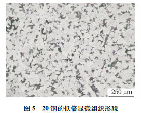 采用尺寸为15mm×18mm(直径×长度)的20钢标样。将20钢标样依次用320,600,1000,1500,2000目的碳化硅砂纸进行预磨机磨制,预磨机的转速为700r/min,直到划痕均匀统一;然后依次用粒度为0.5μm和2.5μm的金刚石磨粒抛光膏对试样进行抛光,抛光机的转速为1400r/min,加水间隔时间为20s,抛光时间为6min;用4%(体积分数,下同)硝酸乙醇溶液腐蚀试样7s;最后,将试样置于光学显微镜下观察,结果如图1所示。