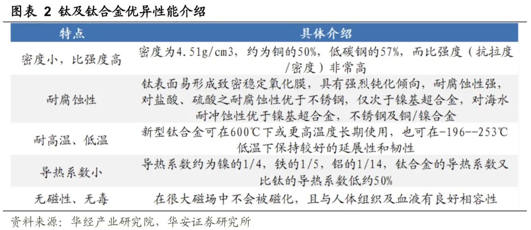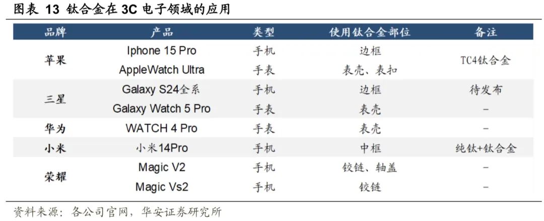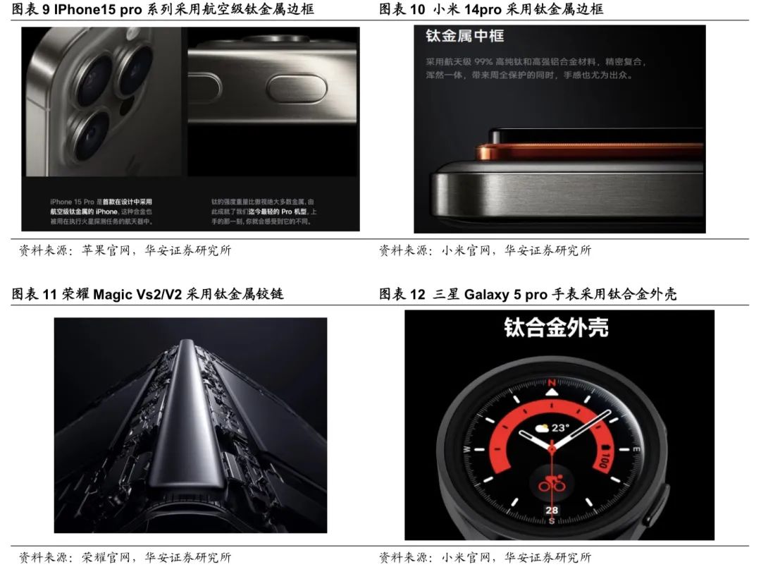 我国钛材及上游海绵钛产量持续增长。根据美国地质调查局,我国海绵钛(钛加工材上游重要原材料)产量稳步增长,占全球产量比例不断提升,2022年全球海绵钛产量26万吨,我国海绵钛产量15万吨,占比57.69%。根据中国金属通报,我国钛加工材产量由2000年的0.22万吨提升至2022年的15.27万吨,产量CAGR为21.2%。钛合金可满足3C电子减重、坚固、耐磨等多重需求。钛合金比强度高、密度小、耐腐蚀及生物兼容性高,用于3C电子可提升其坚固耐用性能同时具备轻量化属性。目前已有部分机型及穿戴设备在边框、背板、铰链等使用钛合金,如IPhone 15pro系列、AppleWatch Ultra、小米15pro钛系列、三星Watch 5pro、荣耀Magic V2折叠屏等。(1)坚固、耐用兼顾减重:以IPhone 15Pro系列为例,其所使用的TC4(Ti-6Al-4V)钛合金为α+β型钛合金,TC4钛合金也是目前使用量最大的钛合金,约占钛合金总产量的50%以上,具有良好的热强性、耐蚀性和低温韧性,广泛应用于火箭壳体和航天器等航空航天领域,故保证了产品的坚固耐用程度。同时由于添加了铝,进一步减小合金密度,使得产品重量变轻。通过对比IPhone 15Pro与IPhone 13/14Pro(使用不锈钢边框)系列,15Pro重量为187 g,13/14Pro重量分别为203和206 g。钛合金中框可在提升产品坚固程度的同时减轻机身重量。(2)良好生物相容性:部分金属元素容易与人体汗液中的盐离子反应,使得金属元素更加活泼(离子化),渗透入皮肤后引发金属过敏的成分,常见易引发金属过敏的元素有镍、钴、铬。钛合金与人体组织和血液相容性好,为亲生物金属,可在医学上以钛制成人造骨骼植入体内,用钛合金制作产品外壳可避免金属过敏。(3)美观,不留指纹:钛合金硬度高,热形变小,耐腐蚀,且为亲生物金属,故而保证手机或手表外壳不易变形、划伤、磕碰与褪色,不留指纹,增强产品美观度。