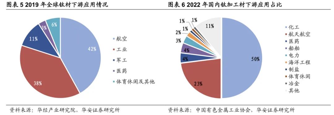 全球钛材主要应用于航空及工业领域,我国钛材在航空航天领域应用仍有较大提升空间。根据华经产业研究院的统计数据显示,2019年全球钛材下游应用集中于航空(42%)及工业(38%)领域。根据中国有色金属工业协会的数据,我国2022年钛加工材下游则主要应用于化工,占比50%,航空航天领域应用占比仅为23%,可见我国钛材在航空航天领域的应用仍有较大的提升空间。