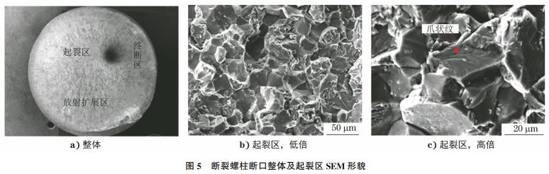 将断裂螺柱断口试样置于扫描电镜下观察,结果如图5,6所示。由图5可知:断口整体较为平整,没有明显的塑性变形,整个断口呈放射状脆断形貌特征,可明显分为起裂区、裂纹扩展区和终断区,断口起裂位置为螺柱心部,并由心部向四周放射状扩展,起裂区呈典型的沿晶特征,晶面伴有爪状纹。