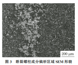 进一步对断裂螺柱金相试样进行扫描电镜及能谱分析,断裂螺柱存在较为明显的成分偏析带,结果如图3所示。