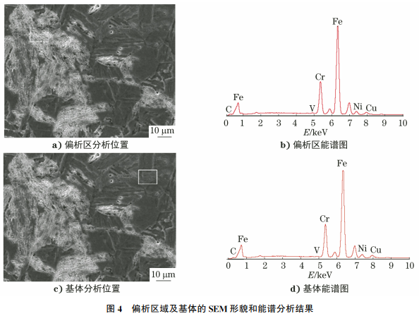 对偏析带和基体分别进行能谱分析,结果如图4所示。由图4可知:成分偏析区域除C元素含量明显比基体高,其他主元素含量与基体相当。