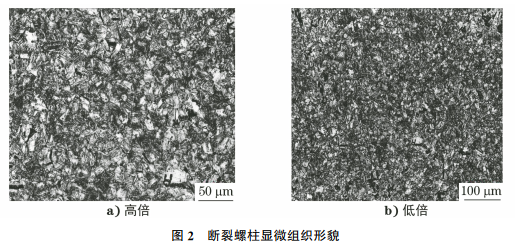 断裂螺柱以及同批次未断裂螺柱基体的显微组织均为回火马氏体+少量铁素体,不存在异常硬脆组织,晶粒度为6~7级,非金属夹杂等级也在设计范围内。