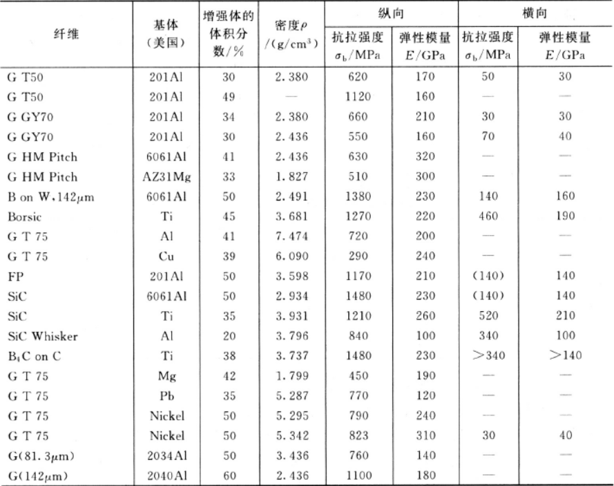 与传统金属材料相比,MMC具有较高的比强度、比刚度和耐磨性;与树脂基复合材料相比,MMC具有优良的导电、导热性,高温性能好,可焊接;与陶瓷基复合材料相比,MMC具有高韧性、高冲击性能、线膨胀系数小的特点。实用的MMC应表现出低的密度和能与当前工程材料相比的力学性能。几种典型的金属基复合材料的力学性能列于表1中。