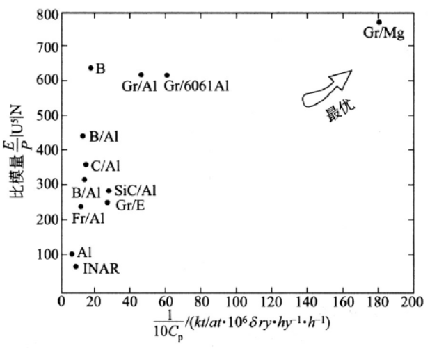 金属基复合材料中所用的增强物碳纤维、碳化硅纤维、晶须、颗粒、硼纤维等既具有很小的热膨胀系数,又具有很高的模量,特别是高模量、超高模量的石墨纤维具有负的热膨胀系数。加入相当含量的增强体不仅大幅度提高材料的强度和模量,也使其热膨胀系数明显下降并可通过调整增强体的含量获得不同的热膨胀系数,以满足各种工况要求。例如,石墨纤维增强镁基复合材料,当石墨纤维的体积分数达到48%时,复合材料的热膨胀系数为零,即在温度变化时使用这种复合材料做成的零件不发生热变形,这对人造卫星构件特别重要。通过选择不同的基体金属和增强体,以一定的比例复合在一起,可得到导热性好、热膨胀系数小、尺寸稳定性好的金属基复合材料。图3所示为一些典型金属基复合材料和金属材料的尺寸稳定性和比模量。可见,石墨/镁复合材料具有最高的尺寸稳定性和最高的比模量。