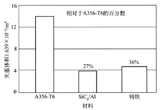 金属基复合材料,尤其是陶瓷纤维、晶须、颗粒增强的金属基复合材料具有很好的耐磨性。这是因为在基体金属中加入了大量的陶瓷增强体,特别是细小的陶瓷颗粒所致。陶瓷材料硬度高、耐磨、化学性质稳定,用它们来增强金属不仅提高了材料的强度和刚度,也提高了复合材料的硬度和耐磨性。图4是碳化硅颗粒增强铝基复合材料的耐磨性与基体材料和铸铁耐磨性的比较,可见SiCp/Al复合材料的耐磨性比铸铁还好,比基体金属高出几倍。SiCp/Al复合材料的高耐磨性在汽车、机械工业中有重要应用前景,可用于汽车发动机、制动盘、活塞等重要零件,能明显提高零件的性能和寿命。