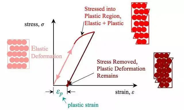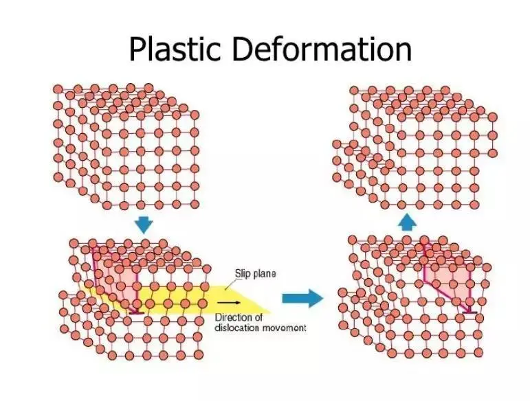 在这一点上,与邻接的初始原子间的键合开始破裂并用一组新的原子进行改造。当这种情况发生时,应力被卸除后材料将不再恢复到原来的状态,即变形是永久的和不可恢复的,这时材料进入塑性变形区(图1)。