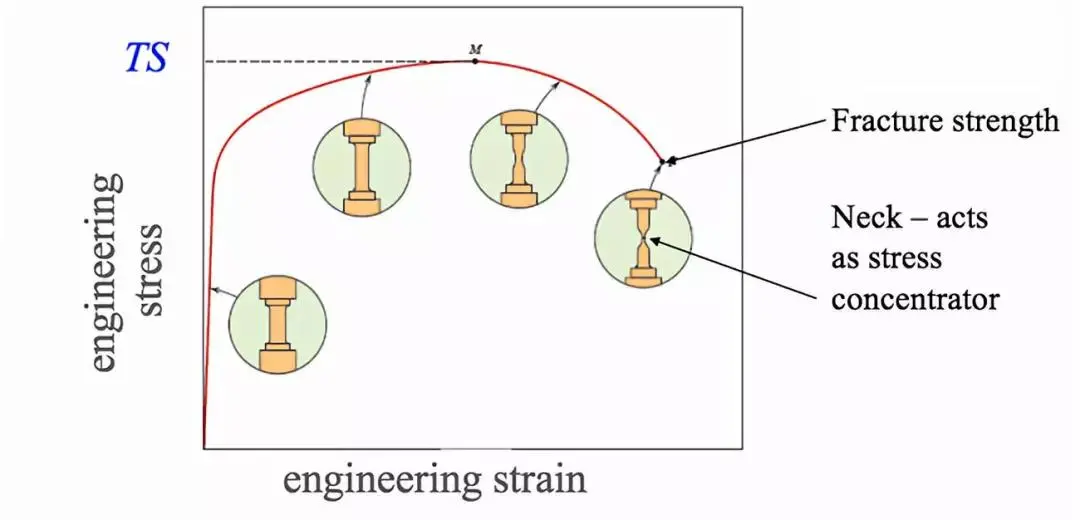继续增加应力,曲线达到最大值。最大值对应抗拉强度,这是曲线的最大应力值,由图中的M表示。断裂点是材料最终断裂的点,由图中的F表示。