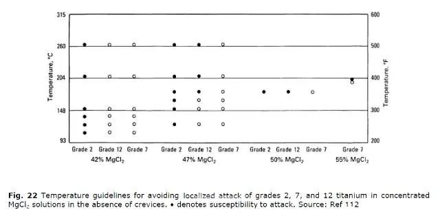 海水的盐度通常小于5%,根据长期的实验和实际使用,认为纯钛可以在120度以下的海水中安全使用,但温度再升高就有可能发生缝隙腐蚀,继续升高就有可能发生点蚀。