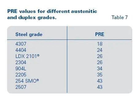 下图为PRE耐腐蚀当量值,耐点腐蚀指数 PRE (Pitting