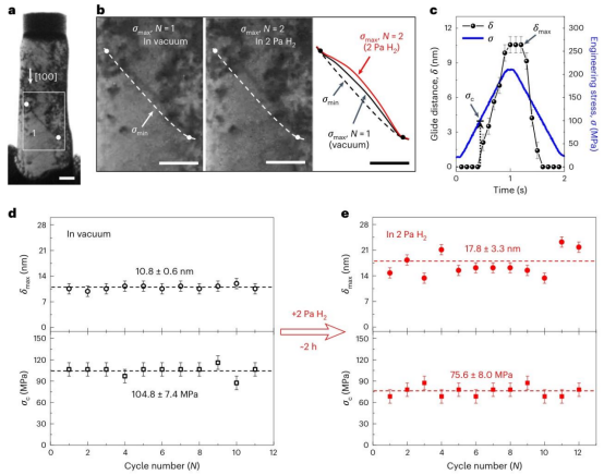 大量研究表明,氢可以促进位错运动。西安交通大学的解德刚和单智伟教授的实验发现,氢显著促进了α-铁中螺型位错的运动,在氢气氛下,启动位错运动的临界应力比真空环境低27%~43%,位错弓出位移平均增加约65%。这是因为氢原子为扭结对形核提供有利位置,降低了位错滑移能垒,还可能降低位错线张力,增加位错弓出位移。