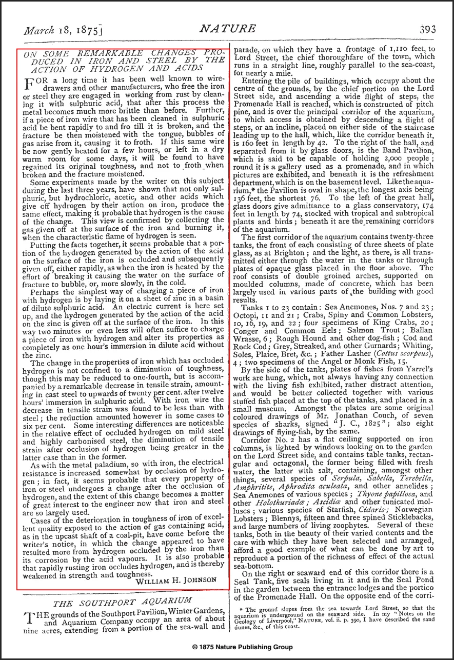 1870-1914年的第二次工业革命,是能源、交通和金属加工等行业协同发展的重要时期。在冶金领域,新方法和工艺的出现,实现了钢铁的大规模生产,钢铁材料广泛应用于建筑、交通等领域,从而彻底改变了20世纪的地理面貌。就在这样的时代背景下,当时在英国钢铁行业工作的冶金学家William H. Johnson,在研究中发现了一个困扰整个拉丝行业的谜团:为清除铁丝和碳钢丝储存中表面的锈迹,通常会将其浸入含酸水的浴槽中(即如今仍在使用的酸洗工艺),但清洗后铁丝和碳钢丝的韧性出现了降低,这种机械性能退化的原因在当时无法解释。针对这个问题,Johnson开展了较为系统的实验研究。1875年,Johnson在Proceedings of the Royal Society of London杂志上发表了一篇完整文章“On some remarkable changes produced in iron and steels by the action of hydrogen acids”,并在同年在Nature杂志刊登了“On some remarkable changes produced in iron and steel by the action of hydrogen and acids”,详细阐述了这一现象。