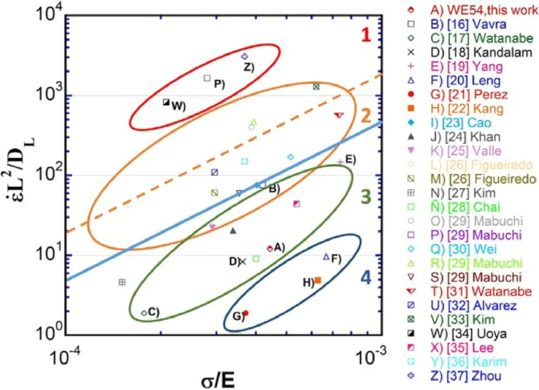 图15. 超塑性镁合金的晶格扩散晶粒尺寸校正的应变速率随归一化应力的变化关系图。图中用彩色椭圆标出了四个区域:(1) “轻”溶质元素与“双相”微观结构;(2) “轻”溶质元素;(3) “重”溶质元素;(4) 易形成LPSO相的“重”溶质元素。
