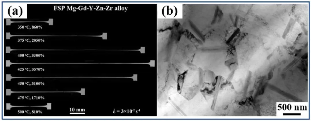 图6. (a) FSP工艺制备的Mg-9Gd-4Y-1Zn-0.4Zr合金在不同温度下以3×10⁻² s⁻¹应变率拉伸至断裂的样品形貌;(b) FSP工艺制备的Mg-9Gd-4Y-1Zn-0.4Zr合金的TEM图像。