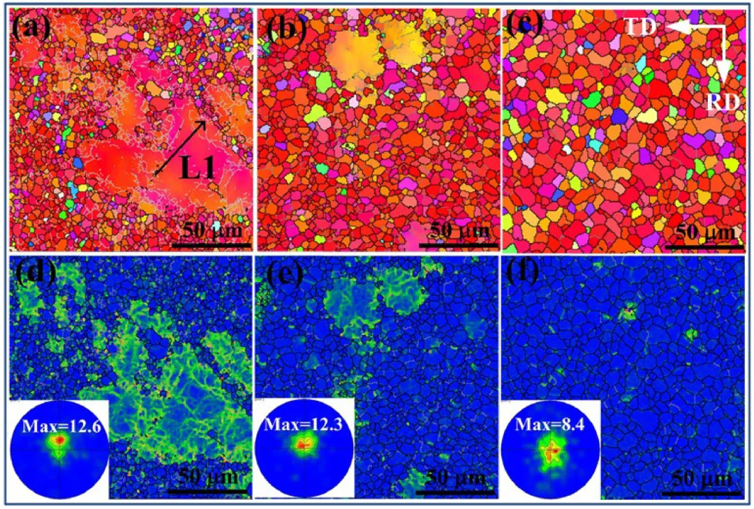图14. 拉伸至不同应变下的HPRed AZ91合金的IPF图像:(a) ~10%;(b) ~100%;(c) ~580%(断裂状态);(d–f) 对应的KAM图。