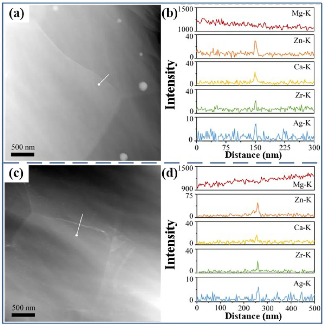 图12. (a) 轧制退火态ZXKQ1000合金的代表性HAADFSTEM图像;(b) 对应的EDS扫描结果;(c) ZXKQ1000合金在300°C和1×10⁻³ s⁻¹条件下拉伸至~220%应变时的HAADFSTEM图像;(d) 对应的EDS扫描结果。