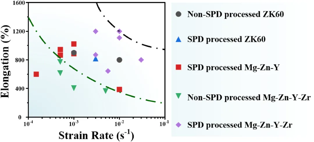 图5. 典型超塑性Mg-Zn系合金的力学性能统计。虚线显示了应变率与超塑性之间的权衡关系。